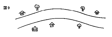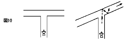 道路の形態を論じるとなると、他にもいくつかの手法が考えられる。まず以前の方法と組み合わせたやり方として、例えばT字路を90度ではなく少し角度をつけてやるのである。そうすると、図の位置に送受信アンテナを置いてやった場合、電波や「意識の視線」はかなりの割合が矢印の方向に逃げたまま返ってこなくなる。