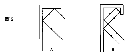 反射回数を増やすことで吸収を狙う手法というのは、もう少し小さな部分に対しても応用可能である。これはむしろ先ほどの楔形領域による吸収の延長線上に位置する発想であるが、例えば屋根のひさしのような部分に関して、図の左のAを右のBのように変更し、前面に上から垂れ下がるような格好で板を取り付けてやることで反射回数を増やしてやることができる。
